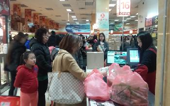 昨日天氣晴朗,法拉盛街頭販賣鮮花及年貨的生意特別好,超市裡人頭洶湧紛紛購買年貨,數量都比平日超出許多,買氣特別旺,許多民眾大包小包買一堆,也造成結帳的櫃台大排長龍。