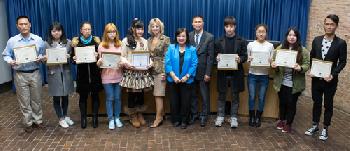 (紐約.羊展恬5日報導)「皇后社區學院」第109期「新進港」春季英文班獎學金頒獎典禮1日在學院科學大樓舉行,會中並舉辦「陳秋貴獎學金」和「朱春林獎學金」頒發儀式,其中陳秋貴獎學金共8位獲獎人,另一名學生獲得朱春林獎學金。