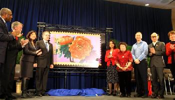 (紐約.羊展恬11日報導)美國郵政署日前在紐約聖若望大學(St.John's University)舉行猴年郵票首日發行儀式,包括郵票設計人華裔畫家麥錦鴻(Kam Mak)與國會眾議員孟昭文,美國郵政署東北地區運作副總裁Richard Uluski,聖若望大學首位亞裔女校長Clavel Gempesaw,聖若望大學東亞研究所所長李又寧教授等人一起主持新郵票發售揭幕,共同慶祝農曆新年的來臨。