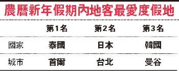 (中國)新年假期,內地有600萬人赴海外旅遊購物,最受中國人歡迎的旅遊目的國依次是泰國、日本、韓國,健康理療則成農曆年出遊的最大主題;亦有青年人為逃避親友催婚催生而出國減壓。