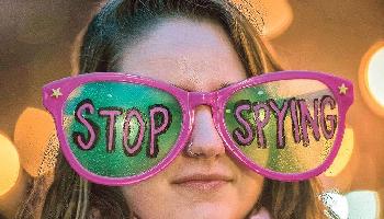 • 反監控人權本周二(23日)在聯邦調查局的華盛頓總部外示威,一名參加者戴上標示“停止間諜活動”的大眼鏡。(圖:法新社)