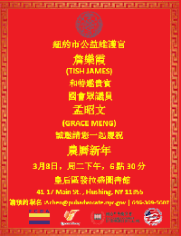 (紐約.羊展恬27日報導)為慶祝亞裔農曆新年成為紐約市首次創造歷史成為全市的公校假日,紐約市公益維護官詹樂霞(Letitia James)將在3月8日(週二)晚間6點30分,在皇后區法拉盛緬街圖書館(41-17 Main St.,Flushing, NY 11355)舉行慶祝會(如圖),並廣邀社區各界人士參加。