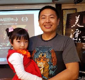 飾演京劇大師演員呂維忠(右一)帶著女兒出席記者會暢談自己的在美的親身經歷 。(圖:羊展恬攝)