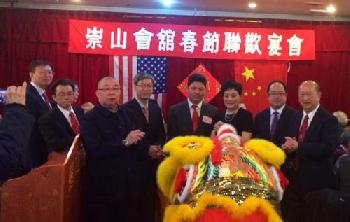 (紐約.留天佑2日報導)紐約崇山會館假華埠舉行春節聯歡晚宴,數百鄉親和嘉賓出席,席間有舞獅助慶,場面熱鬧。中國駐紐約副總領事鍾瑞明、美東華人社團聯合總會代主席朱天長等親臨道賀。