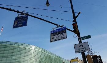 市交通局近來已在法拉盛市中心掛上新法的標誌,琳瑯滿目的交通信號令人眼花繚亂。(圖:羊展恬攝)
