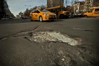 紐約路面坑洞多,造成汽車隨時落坑,輪胎受損;行人一不小心就掉進大小坑洞失去平衡跌倒,扭傷足踝,也是屢見不鮮。