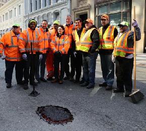 昨日上午,市長白思豪,聯同交通局局長波利(Polly Trottenberg)等多名官員,一起親手修補,位於曼哈頓東村東13街的第1萬個坑洞(圖)。