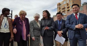 國會眾議員孟昭文(右三)昨日與法拉盛選區的州市議員共同宣佈長島鐵路法拉盛緬街車站改建工程啟動,增新電梯方便耆老殘疾者。(圖:羊展恬攝)