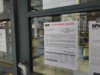 根據市樓宇局曼哈頓區域主任簽發的停工令(Stop Work Order),工地須即時停止所有主要改建活動。據暸解,工地目前為止,僅擁有一份暫時內部改建許可,可以進行一些水管或電線重修,及內牆修復等工程。