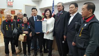 紐約州眾議員金兌錫的代表Tony(左四)向婦慈會會長孫運悌(右四)頒發表揚狀,感謝該會多年持續關心和幫助社區及弱勢群體。(圖:羊展恬攝)