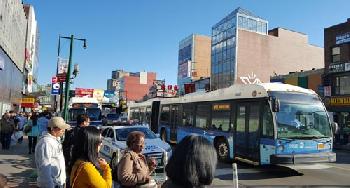 法拉盛街頭人車踴擠,過多的巴士已造成市中心的交通安全問題亟待解決。(圖:羊展恬攝)