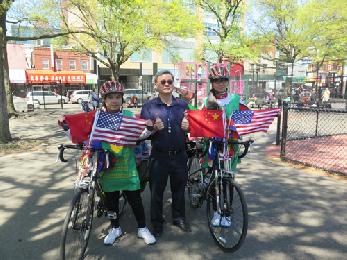 (紐約.羊展恬26日報導)曾在2013年前以騎單車方式環遊世界到訪法拉盛的「順德鐵人」賴立坤,日前再次到訪紐約,不同的是,此行騎單車遊世界多了個同伴,就是在2014年加入的北京體育大學大二學生張慧。兩人日前抵達法拉盛,受到法拉盛社區守望互助隊隊長朱立創的歡迎,並分享他們旅途經歷與感受。
