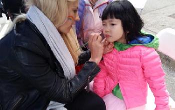 • 華裔女孩讓志願機構人員在臉頰塗上愛心圖案。 (圖:留天佑攝)