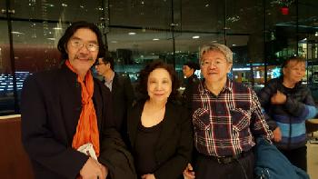 會後,簡名彥(前排右一)與40多年前一起在紐約茱莉亞學院進修舞蹈科的紐約資深華裔編舞家陳學同(左一)在林肯中心大廳相遇,同窗老友海外相聚十分高興,圖中為幼獅青少年管弦樂團藝術總監方秀蓉。