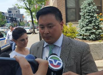 曾出面幫助受害人梁佳佳成立信託基金會的州眾議員金兌錫,昨日前往109分局瞭解案情並向媒體說明受害人梁佳佳的近況。(圖:本報記者攝)