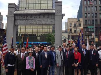 (紐約.留天佑31日報導)紐約華裔退伍軍人會昨日中午在曼哈頓華埠舉行年度國殤紀念日(Memorial Day)遊行。在儀仗隊的帶領下,身穿威武制服的退伍軍人隊伍從勿街開始遊行,然後來到華裔軍人忠烈坊獻花圈(圖),全程莊嚴肅穆,沿途吸引了大批華人民眾及遊客夾道圍觀。