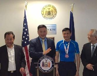 現年60歲法拉盛居民李元(右二),去年參加55-59歲組的全美1500呎競走比賽榮獲第三名,昨日獲得州眾議員員金兌錫(左二)、杜彼得(左一)及王能(右一)等社區領袖的表揚與道賀。(圖:金兌錫辦公室提供)