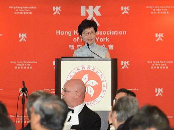林鄭月娥出席紐約香港協會晚宴時(圖),重點闡述香港的競爭力及在中國「一帶一路」倡議下香港的角色。