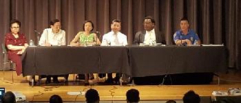 一場「預防竊盜講座」昨日在法拉盛緬街圖書館舉行,圖為出席講座的代表從右至左為109分局預防犯罪員警伯格、皇后區檢察官辦公室執行助理檢察官史萊、市議員顧雅明、前州眾議員楊愛倫、防盜專家高宇權及夫人盛廣蘭。(圖:羊展恬攝)