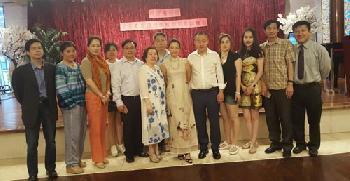 參選北卡第四國會眾議員選舉的華人符江秀(右六)昨日在法拉盛舉行首場籌款會。符江秀身穿一襲改良的中式旗袍與會,向到場的支持者表示感謝。(圖:羊展恬攝)