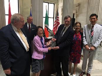 會場正中央,英國、香港、愛爾蘭和海地的旗幟與國旗並列,以代表4位首屆漢密頓移民貢獻獎(Alexander Hamilton Immigrant Achievement Awards)獲獎者來美前的祖籍。大會向他們頒發獎狀,表彰他們在不同的領域中為國家作出奉獻。