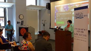 來自西語裔社區的資深報人、新任州務卿羅薩多(Rossana Rosado)昨日在亞美聯盟執行董事Jo-Ann Yoo等多位移民權益關注團體的見證下,在市立大學少數族裔新聞研究所,公佈有關計劃(圖)。