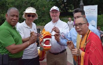 昨日的點睛儀式,是紐約香港龍舟節自6月起舉辦的系列宣傳活動之一。紐約市公園局局長西爾華(Mitchell J. Silver)、香港駐紐約經濟貿易辦事處處長柏嘉禮,以及龍舟節組委會主席萬三權等一起提筆點睛(圖)。主辦單位還特別邀請少林寺海外總會在現場進行功夫表演,吸引不少路過的民眾駐足觀看。