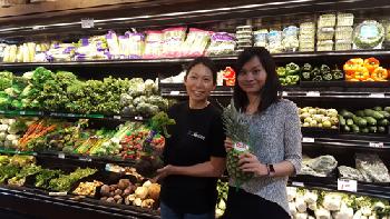 韓裔企業集團「紐約新生命」經理沈艾米(左一)邀請華裔經理許瑋娜(右一)擔任新芽超市的經理,負責對華裔社區推廣有機食品的介紹與說明。(圖:羊展恬攝)