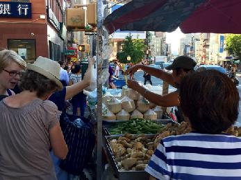 在華埠,夏日水果如椰子等熱賣(圖),不少遊客和僑胞都用各種方式解暑。