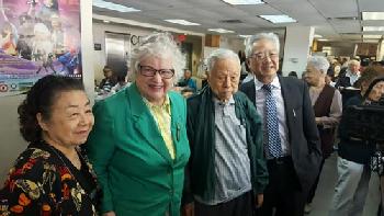 剛在第16州參議員選區民主黨初選中獲勝的史塔文斯基(左二),昨日特別前往法拉盛福壽老人中心謝票,並在中心巧遇支持她的百瑞人瑞104歲老翁侯奇琛(左三),並與福壽老人中心主任王能(左四)及委員會主席羅一玲(左一)合影留念。(圖:羊展恬攝)