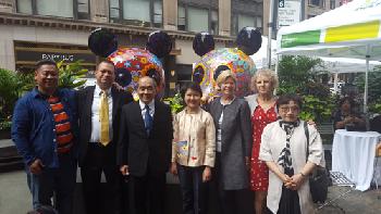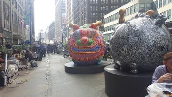(紐約.羊展恬21日報導)一年一度的紐約百老匯時尚特區藝術節自即日起登場,來自台灣的印象畫廊與藝術家洪易,獲得時尚特區聯盟邀請,展出包括圓龍、熊貓家族、大牛、龍馬、三羊開泰、長景祿、鷹鴿水水牛、駱駝等11件大型彩繪雕塑作品並在昨日舉行揭幕式,以充滿故事性的超現實文化符號及繽紛的色彩,吸引眾多觀光客駐足參觀。