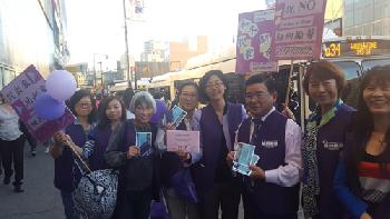 (紐約.羊展恬7日報導)6日是紐約市的Go Purple Day,法拉盛市議員顧雅明及華人社區專門服務家暴受害人的紐約勵馨婦幼關懷中心多位義工,昨日齊聚在人潮最多的法拉盛緬街地鐵站口,發放反家暴的中英文宣傳單,呼籲社區各界人士一起反家暴。