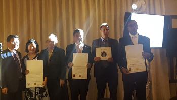 大法拉盛西商會昨晚在法拉盛喜來登大飯店舉行兩周年慶暨籌款晚宴,州參議員史塔文斯基(左三)與市議員顧雅明(左一)聯手頒發社區服務獎給4位對社區有貢獻人士,徐朱留弟(左二)、皇后區韓裔協會理事長柳濟奉、門羅大學資深副校長Evan Jerome和馬其頓教堂牧師Richard McEachern(右三、二、一)。 (圖:羊展恬攝)