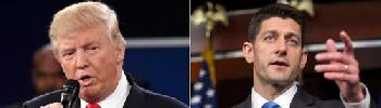 (紐約.明報11日訊)美國共和黨總統候選人川普(左)與衆議院議長瑞安(右)週一爆發衝突,這位議會官職最高的共和黨人已告知其他議員說,他將不再爲共和黨總統提名人助選,也不會再爲他辯護,他甚至暗示爲希拉莉進入白宮做準備。