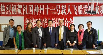 圖說 TY1018d 為慶祝中國神舟十一順利升空,紐約華人僑團聯合會昨日也在法拉盛舉行慶祝會,主席喬立華(右五)及副主席劉比華(左四)、易繼軍(右四)及藝術總監馮潔(右三)等多位僑團領袖及代表都出席表達對祖國航天科技進步的歡喜心情。(圖:羊展恬攝)