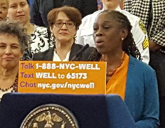 (紐約.羊展恬25日報導)針對近年來紐約市自殺率一直上升,紐約市第一夫人麥克雷(Chirlane McCray),24日在皇后區可樂娜地區進行推廣市府心理健康計劃「茁壯紐約」(Thrive NYC)活動,並宣佈市府一項免費心理諮詢系統已經設立,凡有需要民眾可以打電話到1-888-NYC-WELL,或者以手機撥打WELL65173),就可透過200種不同語言翻譯下,全年每天24小時都可立即與市府心理諮詢服務連線,透過電話與心理諮詢專家討論心理方面的問題。