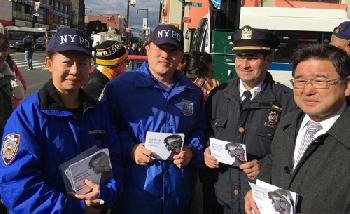 為了更好地與華裔民眾交流,市警109分局還安排普通話流利的華裔社區員警黃凌欽,在法拉盛街頭分發傳單,提醒行動不便的耆老及對紐約交通規則不熟悉的新移民,遵守交通規則,注意交通安全。