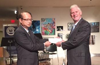 當晚,研討會結束後,經文處也舉行歡迎酒會及贊助「國際永續發展協會」(IISD) 儀式,由副處長蘇瑞仁(左)代表台灣農委會遞交贊助款5萬美元支票予「國際永續發展協會」副執行長Langston James Goree VI(右) ,以示支持該會長期報導聯合國永續發展及環境議題。(如圖,駐紐約台北經文處提供)
