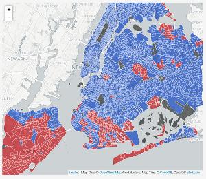 核實數據指,希拉莉在紐約市得票196萬9920張(78.59%,圖藍色區域),川普得票46萬1174張(18.4%,圖紅色區域)。雖然大幅超越川普,但得票數字不及4年前的民主黨候選人奧巴馬。