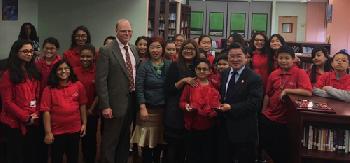 (紐約.羊展恬15日報導)法拉盛189初中14日舉行圖書館蘋果電腦系統落成啟用典禮,包括市議員顧雅明、189初中校長柏格斯Cinday Diaz-Burgos、副校長費志清(George Fitting)及家長會代表Christine Colligan與多位該校學生代表一起出席啟用剪綵儀式(圖)。