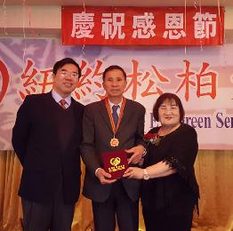 (紐約.羊展恬22日報導)在美國的傳統節日感恩節來臨前夕,紐約松柏愛心會昨天在飛越皇后牡丹廳提前為會員舉辦感恩節慶祝活動並為9到11月的壽星慶生。會長王玉英向支持該會的企業家陳秋貴頒發愛心勳章,感謝他對社區長者的關心與幫助。
