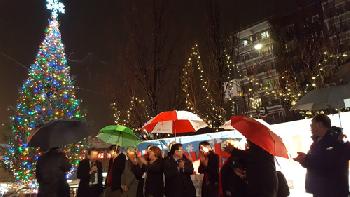 (紐約.羊展恬30日報導)聖誕節將至,一年一度的法拉盛聖誕樹點燈儀式在29日晚舉行,眾多嘉賓在風雨中齊聚法拉盛緬街分館前與圍觀民眾一起倒數,並點亮圖書館門前的聖誕樹。