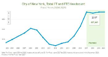 根據公民預算委員會(Citizens Budget Commission)對市府預算紀錄的分析,2012年財政年度,前市長彭博主政時的的市府人員人數,一度只有29萬3550人。