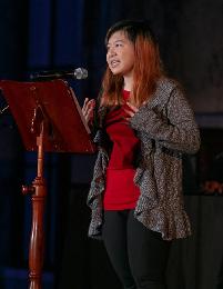 (明報24日訊)在剛結束的第8屆青少年桂冠詩人朗誦比賽中,18歲紐約華裔少女林莎倫(Sharon Lin,譯音,圖)憑藉一首原創詩歌奪冠。該比賽由紐約市競選財政委員會(Campaign Finance Board)與非營利組織「都市說」(Urban Word)聯合舉辦,地點在紐約公共圖書館。
