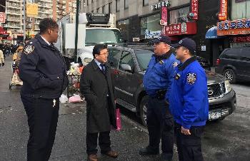法拉盛轄區109分局局長哈里森(左一),昨日下午在社區事務警探歐唐納、員警黃凌欽(右二、右一)陪同下,視察41大道小巴站的交通狀況時,與市議員顧雅明(左二)不期而遇。(圖:本報讀者提供)