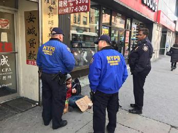 針對法拉盛街頭遊民增加,天氣變冷,哈里森等一行昨日也向街頭遊民進行勸導,要求遊民撤離街頭或入住收容所,以免影響商家作生意。(圖:本報讀者提供)