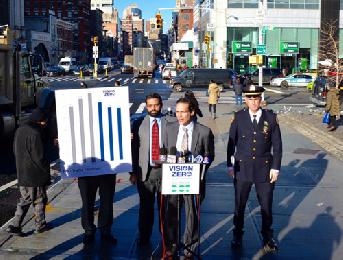 交通局代表羅素(Ryan Russo)及市警督察福頓(Dennis Fulton),在堅尼路曼哈頓橋頭表示,在兩個部門領導的「零死亡願景」下,交通意外死亡人數略減。