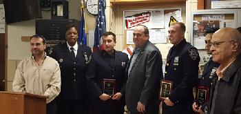 (紐約.羊展恬9日報導)市警109分局昨晚在分局內舉行每月例行警民會議,局長哈里森在會議上,表彰優秀警員,並向逮捕搶案、入室偷竊等反犯罪小組的5名警員授予「本月最佳警員」。