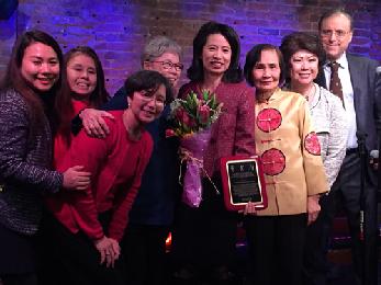 劉林劍虹長期致力於紐約地區青少年活動的開展,表現優異而獲獎。包括華策會創辦人劉毛淑卿(右五)、華埠聯合民主黨主席司徒仲菁(右二)、紐約中華總商會執行長于金山、華埠人瑞中心主任伍寶玲(右三)等人都前往向劉林劍虹致賀。