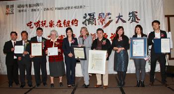 來自聯邦、紐約州、市等民選官員代表18日紛紛到場祝賀明報創立20週年及攝影大賽並向行政總裁劉正廷(左五)頒發表揚狀,圖為(左起)紐約市長白思豪代表林漢明、民主黨黨代表杜彼得、國會眾議員孟昭文代表Jordan H. Goldes、紐約州參議員史塔文斯基、明報行政總裁劉正廷、皇后區長凱茲、紐約市議員顧雅明、紐約州眾議會副議長奧迪茲代表陳素華、紐約市主計長斯靜格代表范小江、紐約州眾議員金兌錫代表曹原。